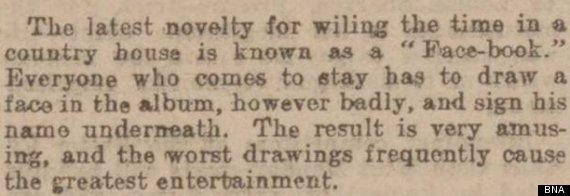The fragment, republished by the British Newspaper Archive, references a 'Face-book' in which "everyone who comes to stay has to draw a face in… however badly, and sign his name underneath".